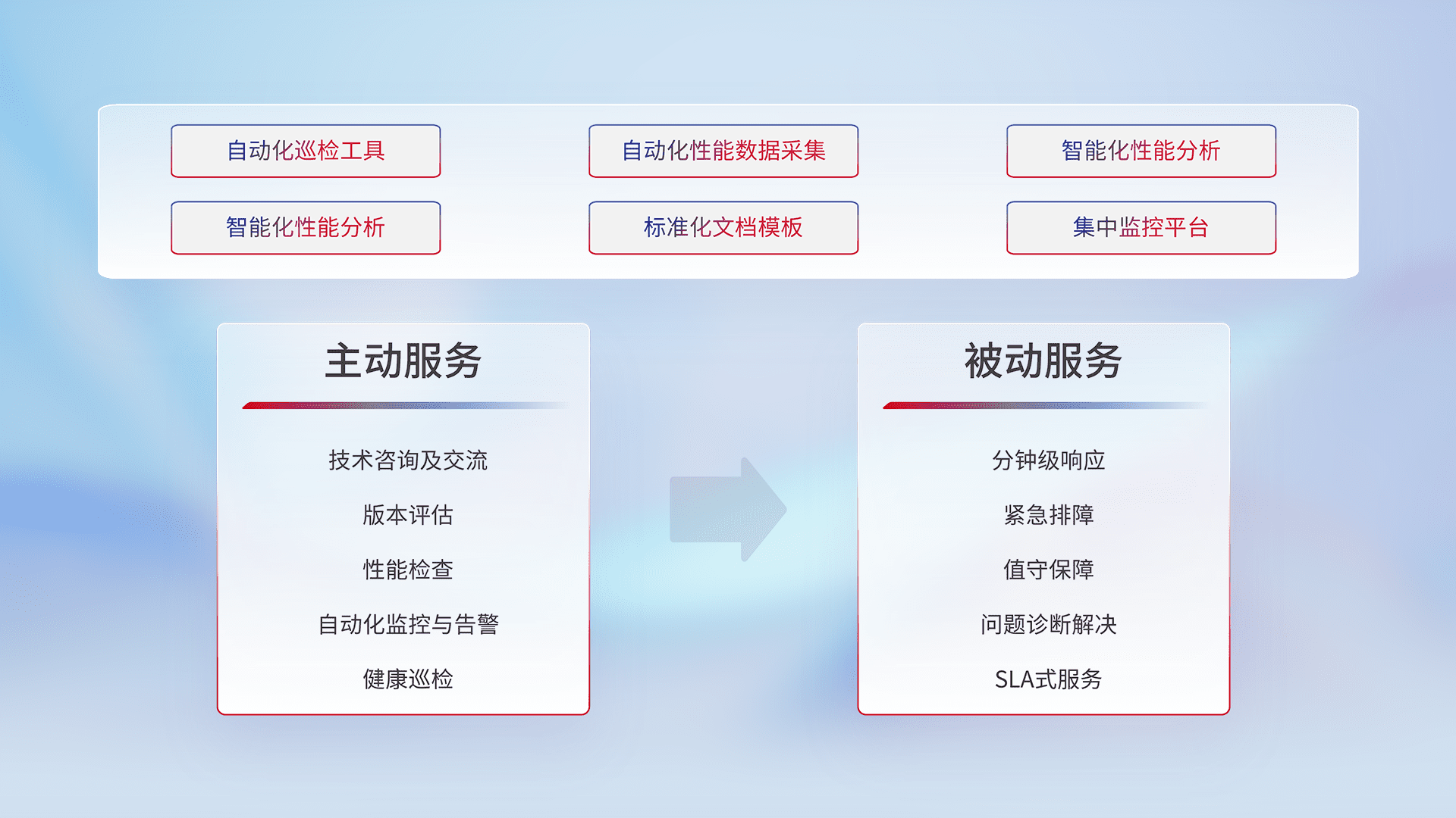 智能化工具和标准化文档,,,保障服务质量,,,,提供主动服务(包含技术咨询、、版本评估、、、性能检查、、、自动化监控与告警、、健康巡检)和被动服务包含(分钟级响应、、、、紧急排障、、值守保障、、、问题诊断解决、、SLA服务)。。。